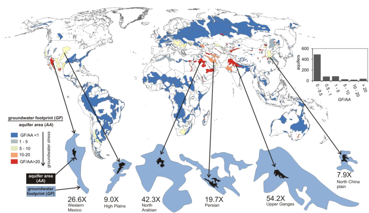 The Groundwater footprint: The dark-blue areas have a groundwater footprint of less than 1; groundwater extraction is sustainable here in the long term as well. However, the red areas in Northern America and Asia have a much larger groundwater footprint. The footprint of the Upper Ganges is actually 54 times larger. The area would have to be 54 times larger to capture the precipitation needed to sustain current groundwater extraction. Groundwater in areas with a large groundwater footprint is severely depleted. The bar chart shows that the groundwater footprint is less than 1 for most areas (80%). The groundwater is being used sustainably here (Source: Gleeson et al., Water balance of global aquifers revealed by groundwater footprint. Nature 488 197–200).
